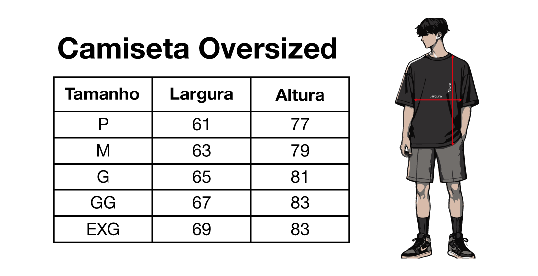 Atenção: Nossa modelagem oversized é bem ampla. Antes de escolher seu tamanho, confira nossa tabela de medidas.